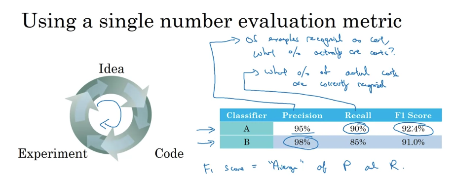 - It turns out that there’s often a tradeoff between precision and recall, and you care about both. → When the classifier says something is a cat, there’s a high chance it really is a cat. But of all the images that are cats, you also want it to pull a large fraction of them as cats. (분류기가 고양이라고 말하면 그게 실제로 고양이일 확률이 높기를 원합니다. 그러나 고양이 이미지 중에서도 많은 이미지를 고양이로 분류할 수 있기를 원합니다.)