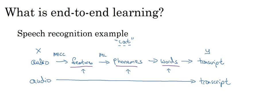 - When you have a smaller data set, the more traditional pipeline approach actually works just as well. Often works even better. And you need a large data set before the end-to-end approach really shines. And if you have a medium amount of data, then there are also intermediate approaches where maybe you input audio and bypass the features and just learn to output the phonemes of the neural network, and then at some other stages as well.
