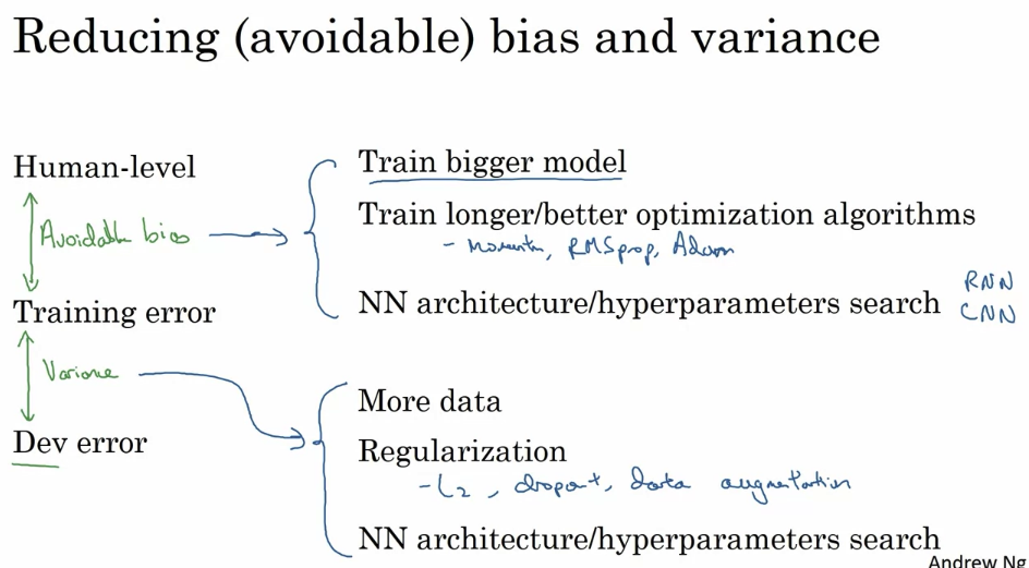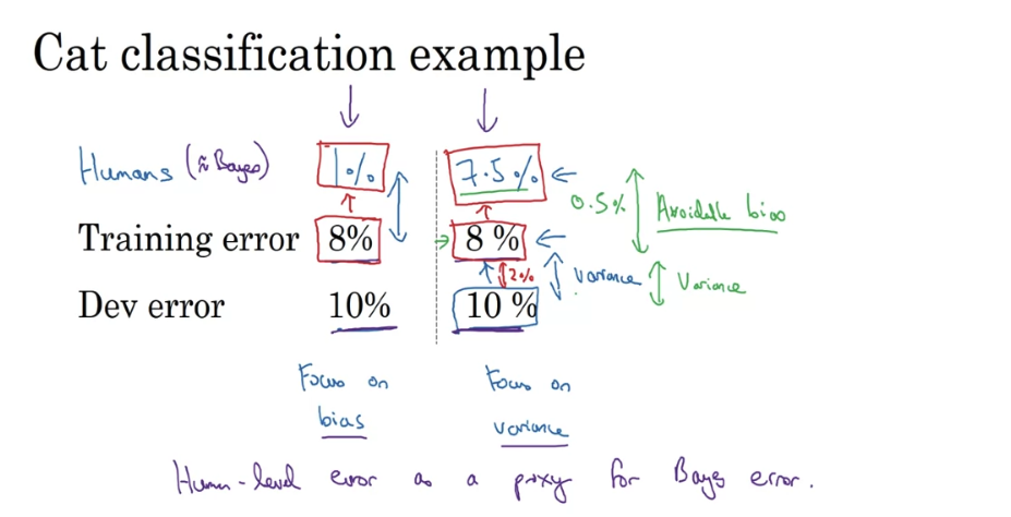 - The term avoidable bias acknowledges that there’s some bias or some minimum level of error that you just cannot get below which is that if Bayes error is 7.5%, you don’t actually want to get below that level of error. So rather than saying that if you’re training error is 8%, then the 8% is a measure of bias in this example, you’re saying that the avoidable bias is maybe 0.5% or 0.5% is a measure of the avoidable bias whereas 2% is a measure of the variance and so there’s much more room in reducing this 2% than in reducing this 0.5%.