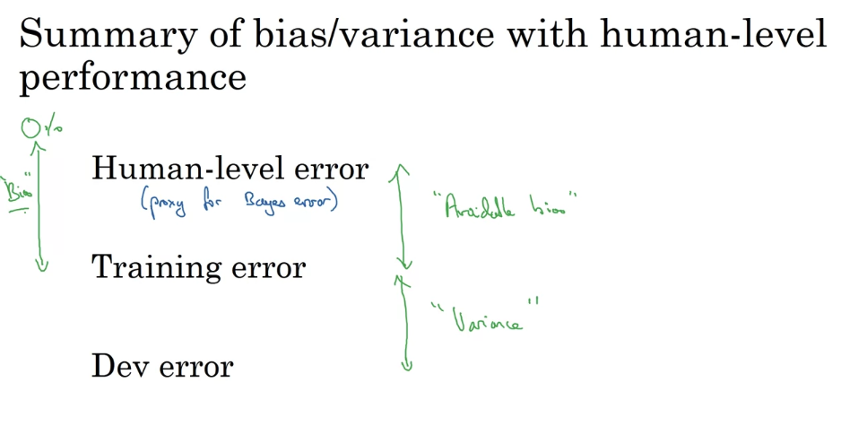 - so the difference between your estimate of Bayes error tells you how much avoidable bias is a problem, how much avoidable bias there is. And the difference between training error and dev error, that tells you how much variance is a problem, whether your algorithm’s able to generalize from the training set to the dev set. And the big difference between our discussion here and what we saw in an earlier course was that instead of comparing training error to 0%.