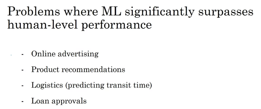 - Finally, all of these are problems where there are teams that have access to huge amounts of data. So for example, the best systems for all four of these applications have probably looked at far more data of that application than any human could possibly look at. And so, that’s also made it relatively easy for a computer to surpass human-level performance.
