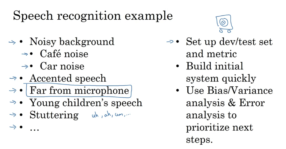 what I would recommend you do, if you’re starting on building a brand new machine learning application, is to build your first system quickly and then iterate. What I mean by that is I recommend that you first quickly set up a dev/test set and metric. So this is really deciding where to place your target. And if you get it wrong, you can always move it later, but just set up a target somewhere.
