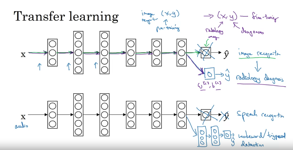 - For speech recognition, maybe you’ve trained the speech recognition system on 10000 hours of data. So, you’ve learned a lot about what human voices sounds like from that 10000 hours of data, which really is a lot. But for your trigger word detection, maybe you have only one hour of data. So, that’s not a lot of data to fit a lot of parameters. So in this case, a lot of what you learn about what human voices sound like, what are components of human speech and so on, that can be really helpful for building a good wake word detector, even though you have a relatively small dataset or at least a much smaller dataset for the wake word detection task. So in both of these cases, you’re transferring from a problem with a lot of data to a problem with relatively little data.
