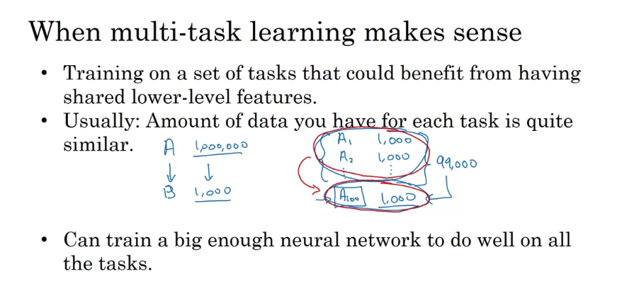 So the second bullet isn’t a hard and fast rule but what I tend to look at is if you focus on any one task, for that to get a big boost for multi-task learning, the other tasks in aggregate need to have quite a lot more data than for that one task. And so one way to satisfy that is if a lot of tasks like we have in this example on the right, and if the amount of data you have in each task is quite similar. But the key really is that if you already have 1,000 examples for 1 task, then for all of the other tasks you better have a lot more than 1,000 examples if those other other task are meant to help you do better on this final task. And finally multi-task learning tends to make more sense when you can train a big enough neural network to do well on all the tasks.